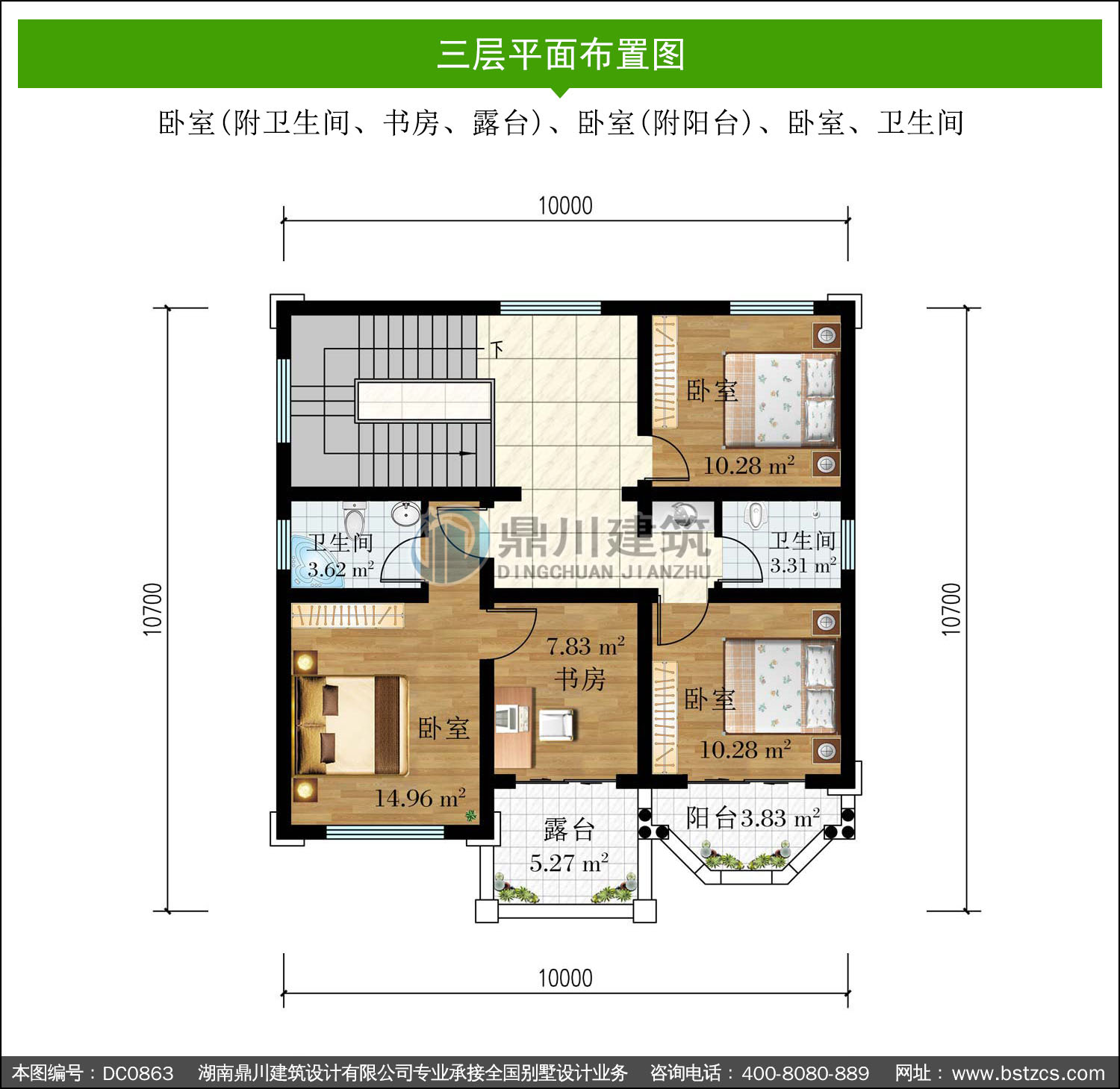 | 三 層: | 臥室(附衛(wèi)生間、書房、露臺(tái))、臥室(附陽(yáng)臺(tái))、臥室、衛(wèi)生間 | |||