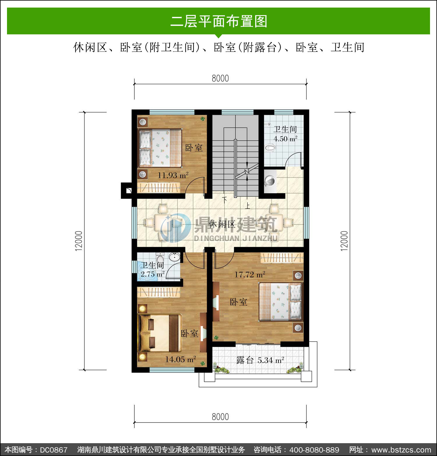 | 二 層: | 休閑區(qū)、臥室(附衛(wèi)生間)、臥室(附露臺)、臥室、衛(wèi)生間 | |||