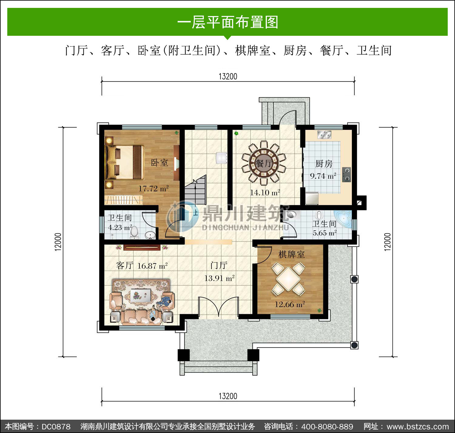| 一 層: | 門廳、客廳、臥室(附衛生間)、棋牌室、廚房、餐廳、衛生間 | |||