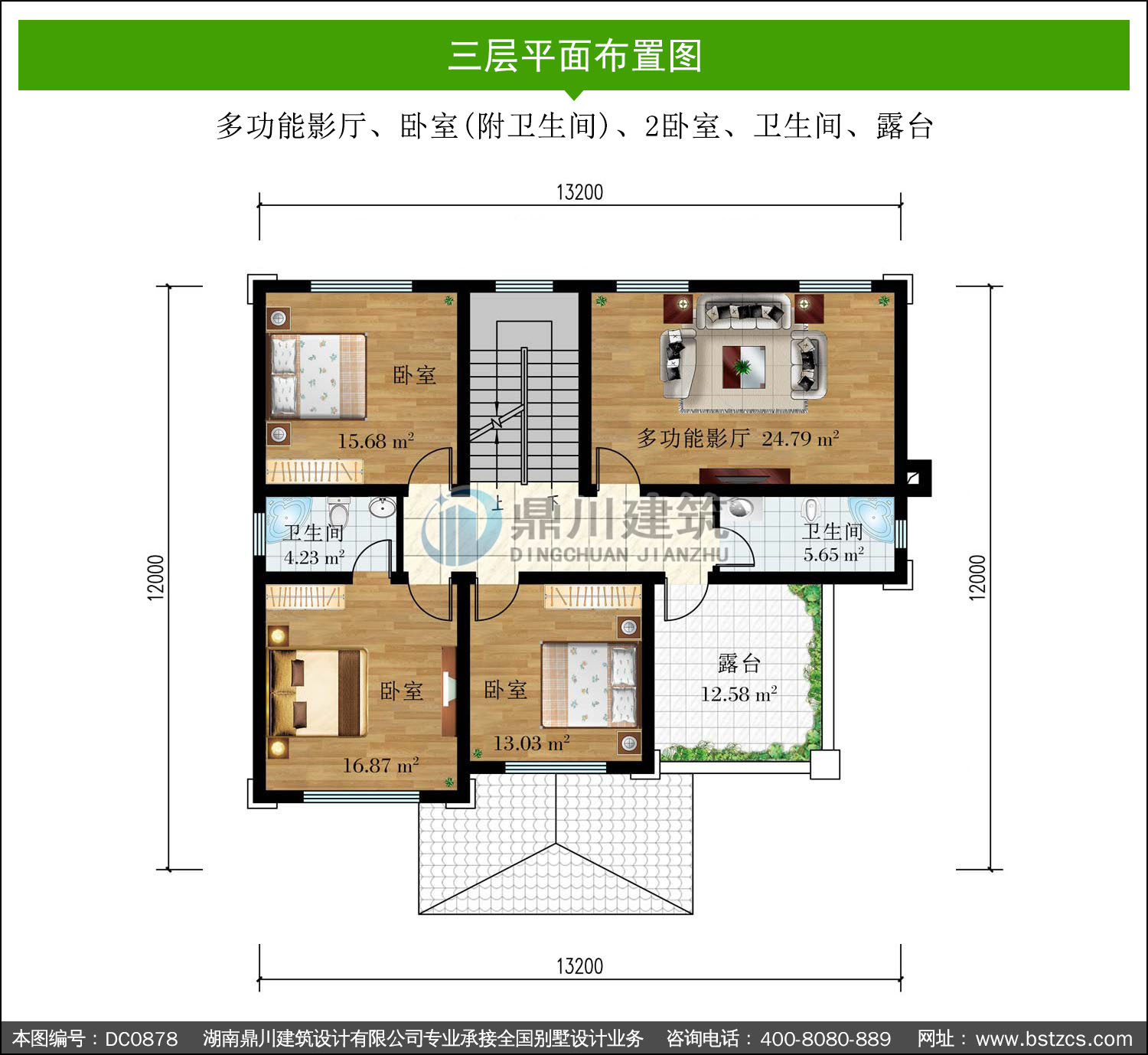 | 三 層: | 多功能影廳、臥室(附衛生間)、2臥室、衛生間、露臺 | |||