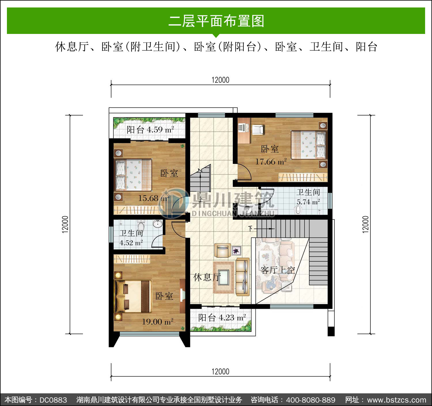 | 二 層: | 休息廳、臥室(附衛生間)、臥室(附陽臺)、臥室、衛生間、陽臺 | |||