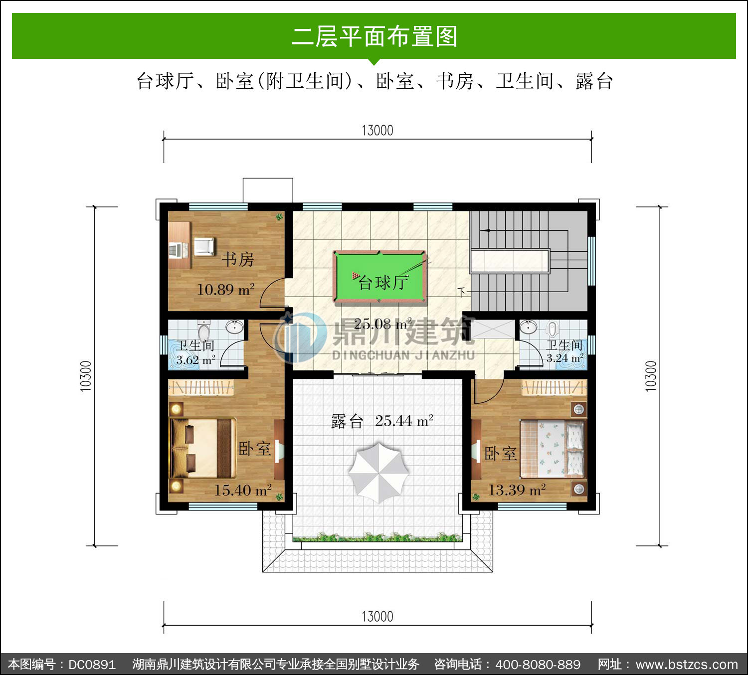 | 二 層: | 臺球廳、臥室(附衛生間)、臥室、書房、衛生間、露臺 | |||
