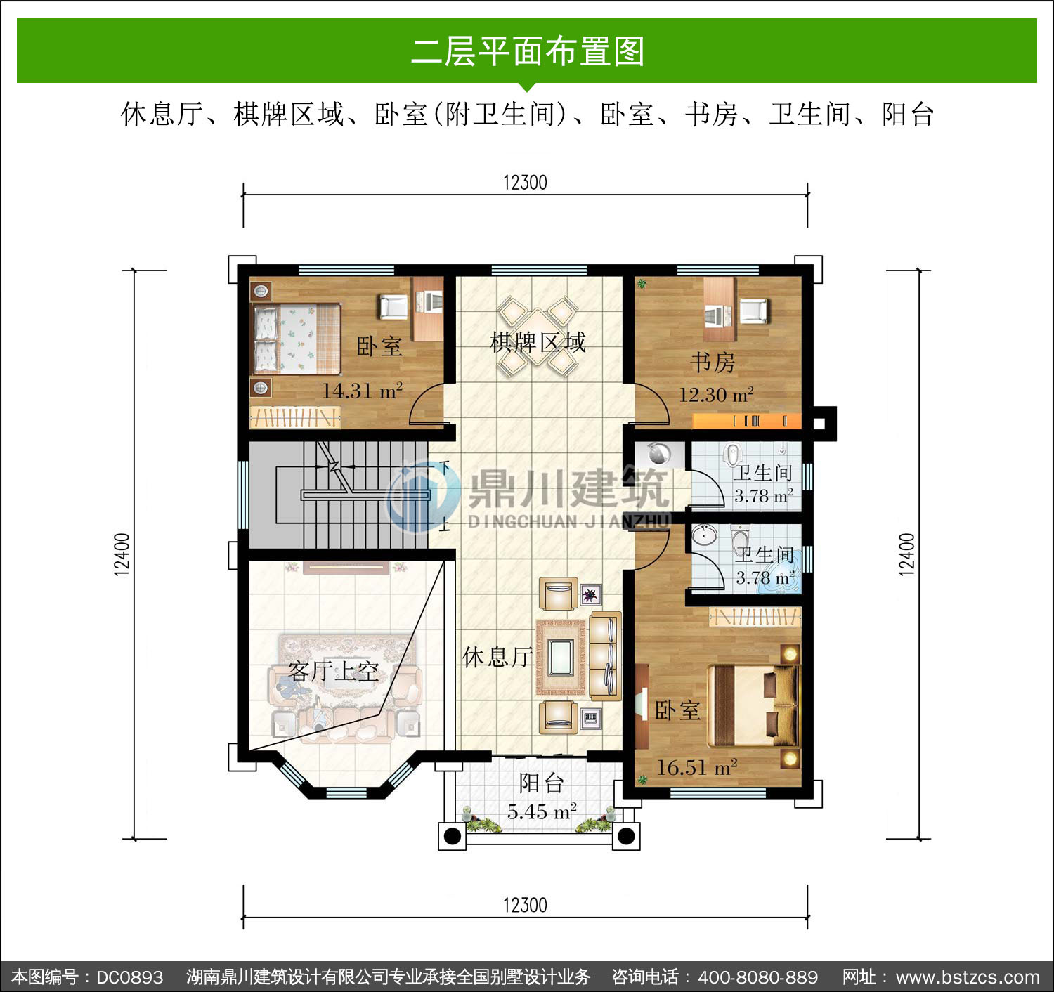 | 二 層: | 休息廳、棋牌區(qū)域、臥室(附衛(wèi)生間)、臥室、書房、衛(wèi)生間、陽臺 | |||