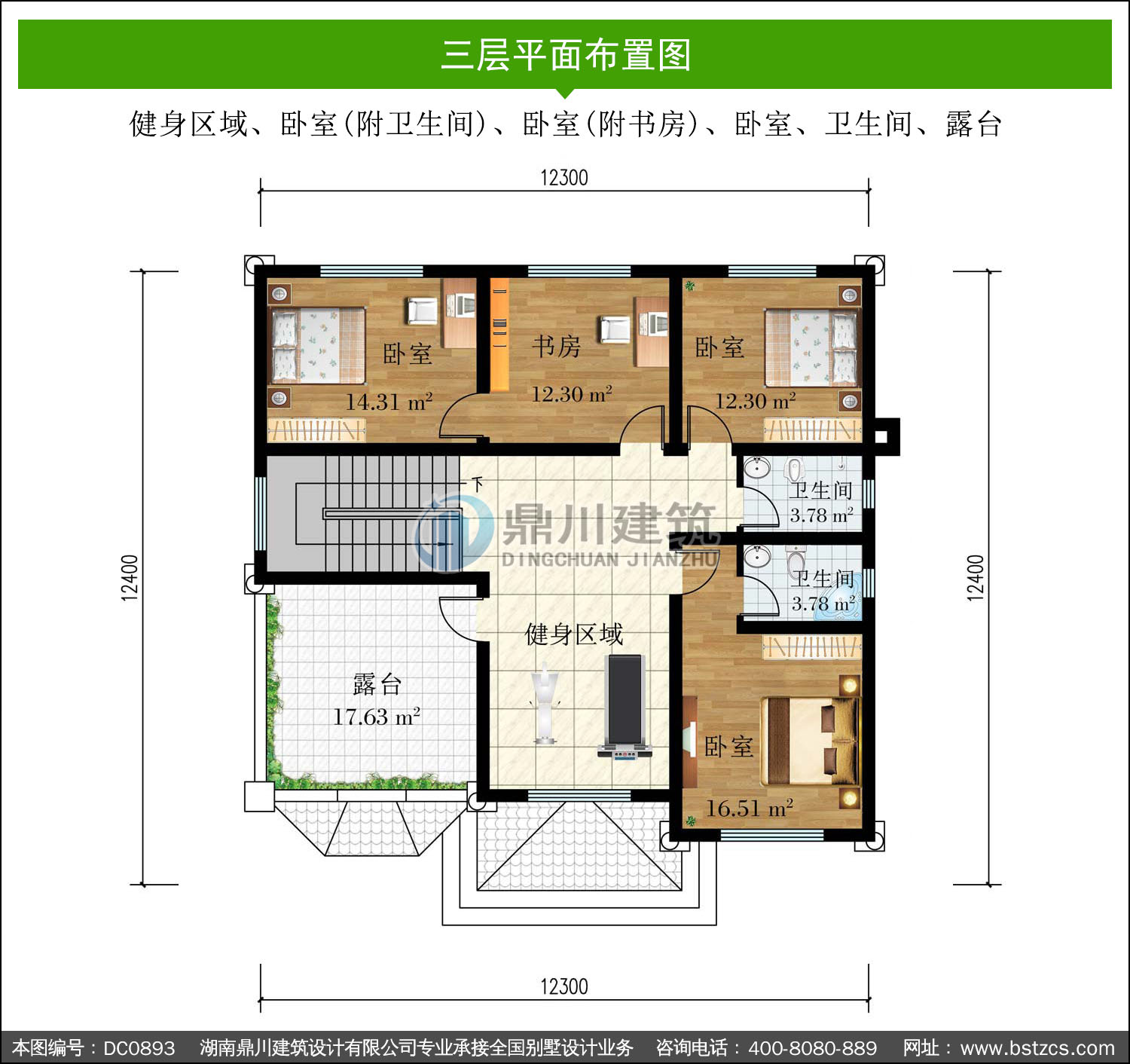 | 三 層: | 健身區(qū)域、臥室(附衛(wèi)生間)、臥室(附書房)、臥室、衛(wèi)生間、露臺 | |||