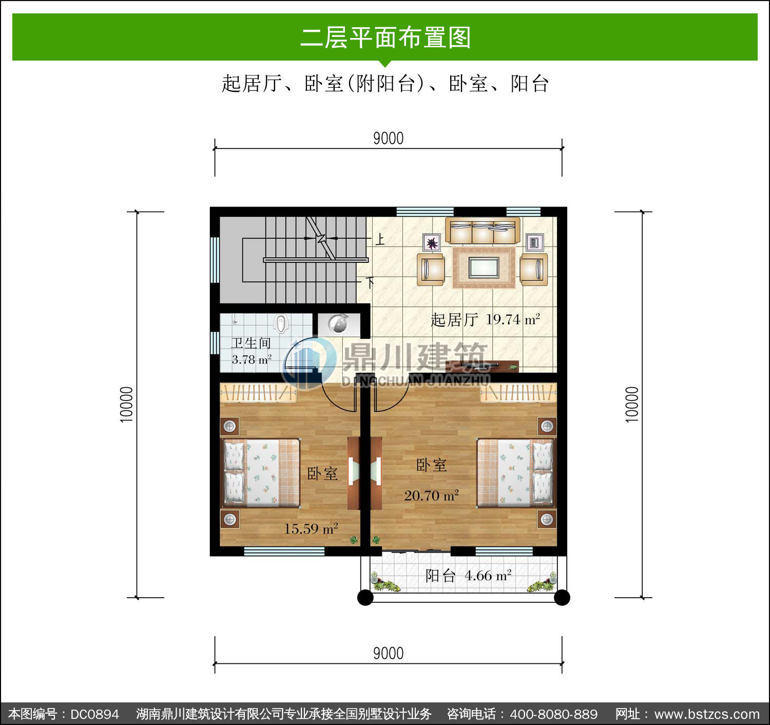 | 二 層: | 起居廳、臥室(附陽臺)、臥室、陽臺 | |||