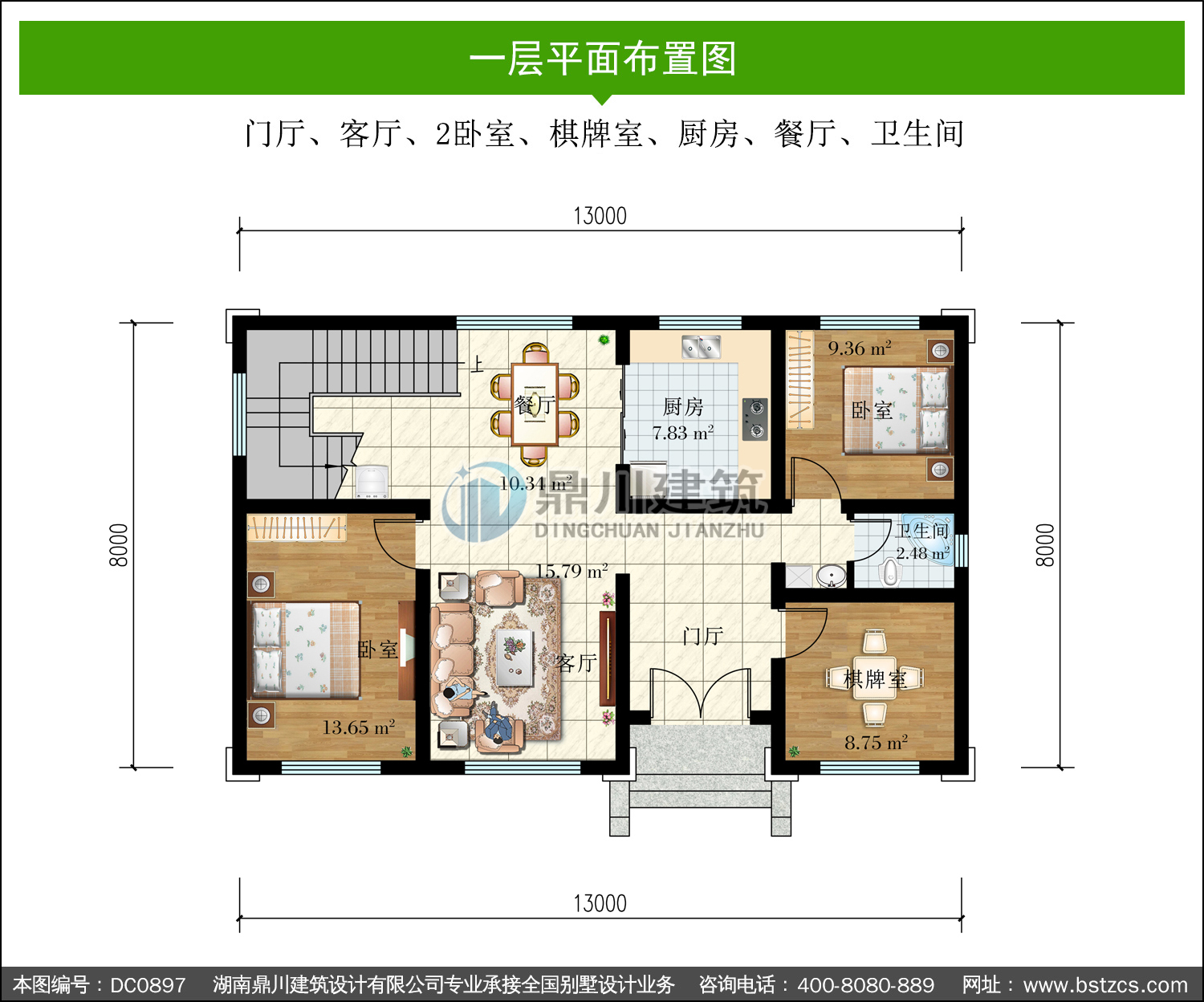 | 一 層: | 門廳、客廳、2臥室、棋牌室、廚房、餐廳、衛生間 | |||
