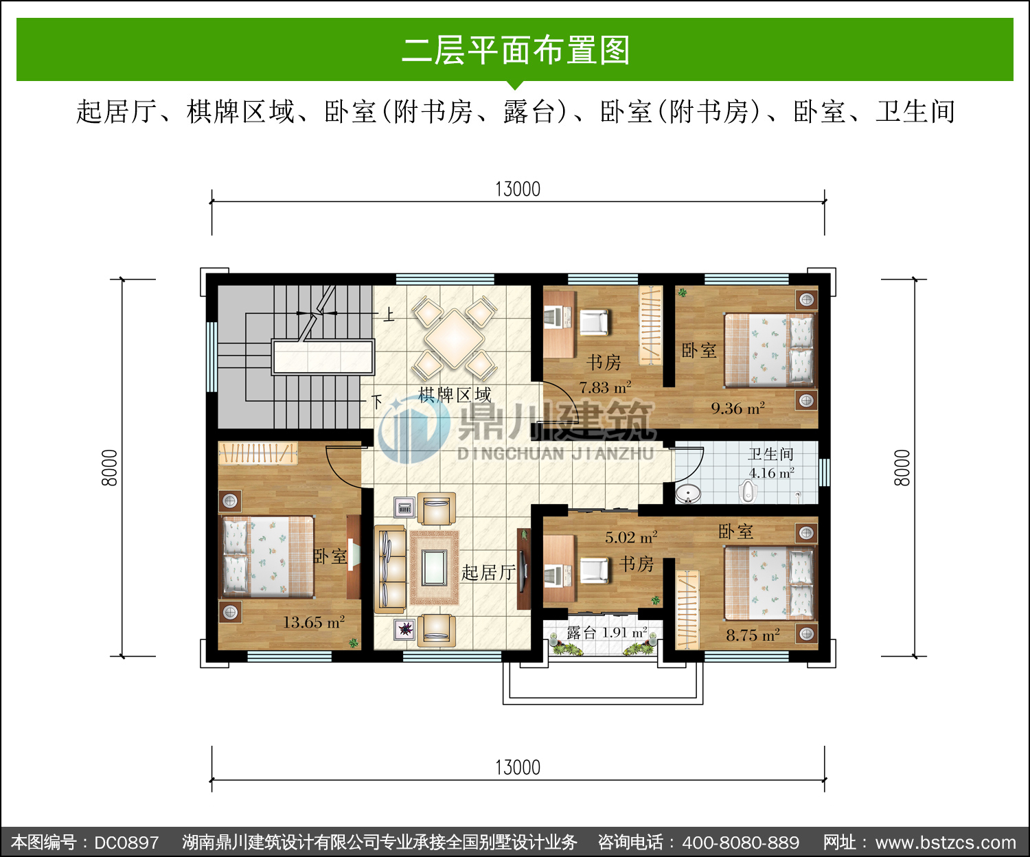 | 二 層: | 起居廳、棋牌區域、臥室(附書房、露臺)、臥室(附書房)、臥室、衛生間 | |||
