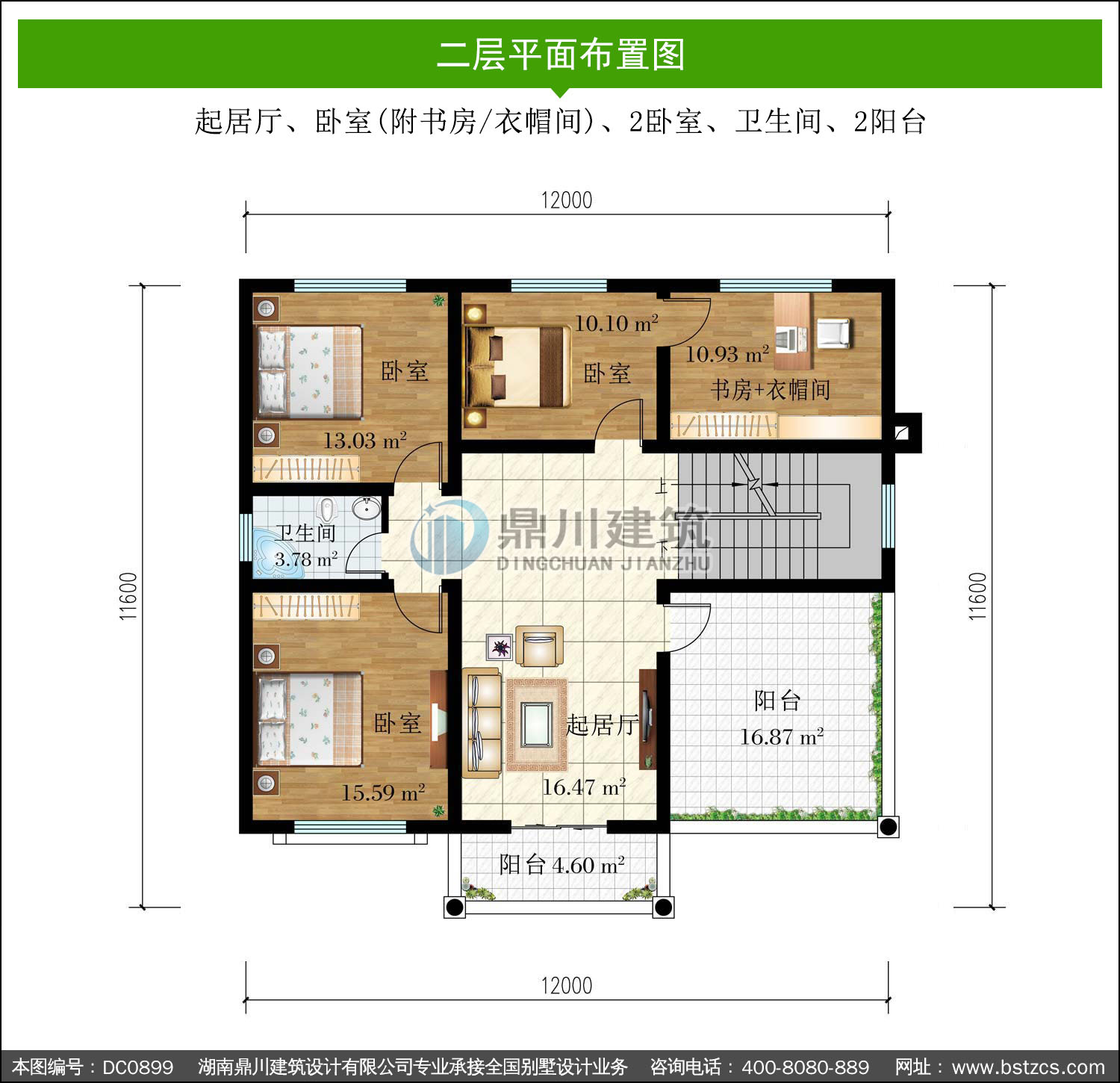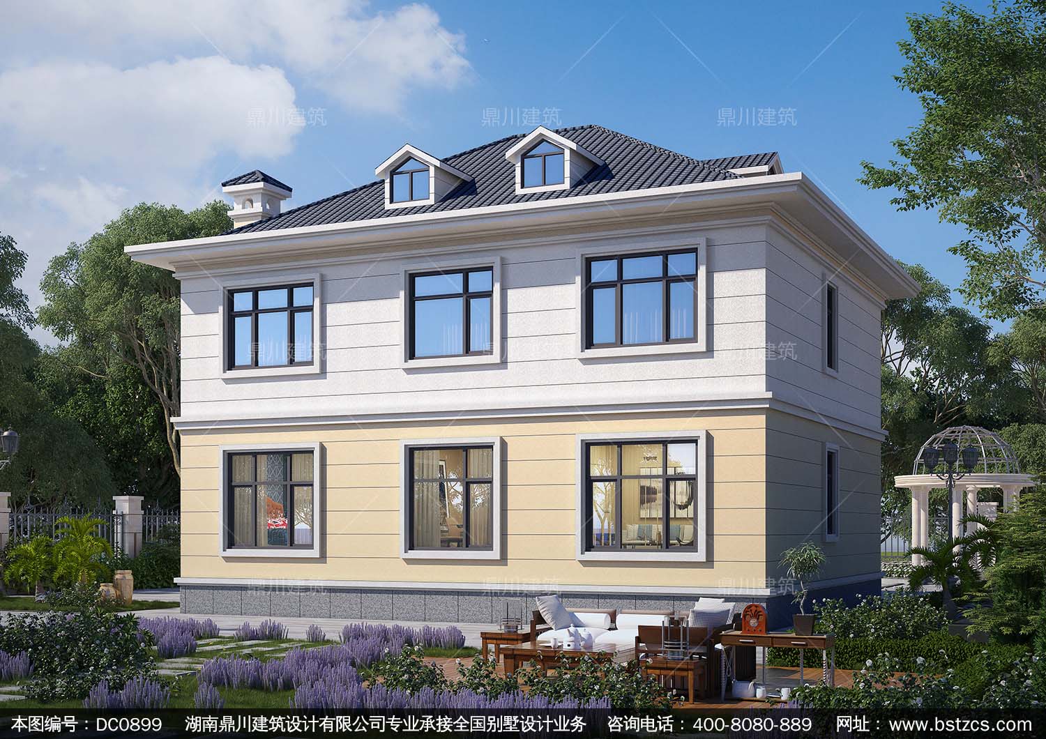 二層簡約帶陽臺小別墅效果圖及施工圖紙_農村自建房設計,鼎川建