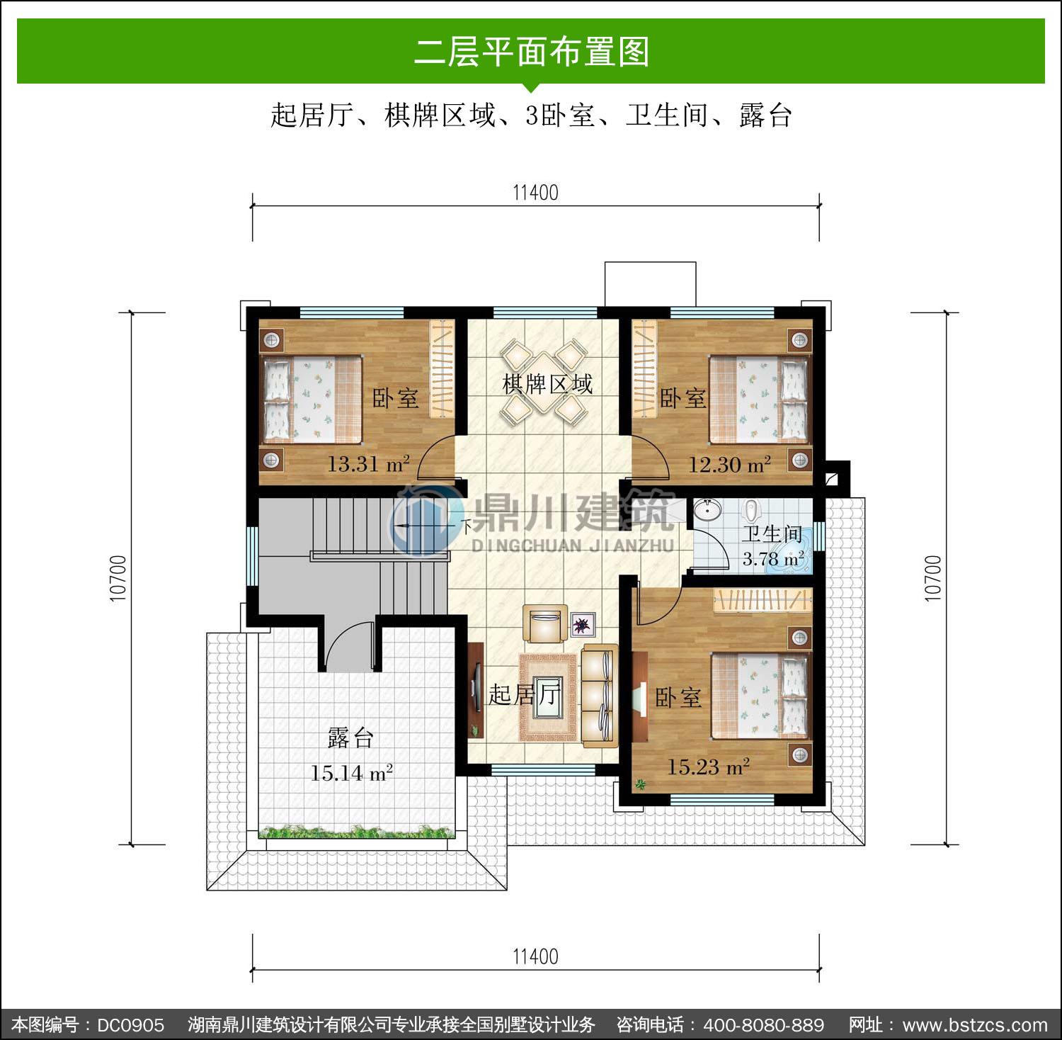 | 二 層: | 起居廳、棋牌區(qū)域、3臥室、衛(wèi)生間、露臺 | |||