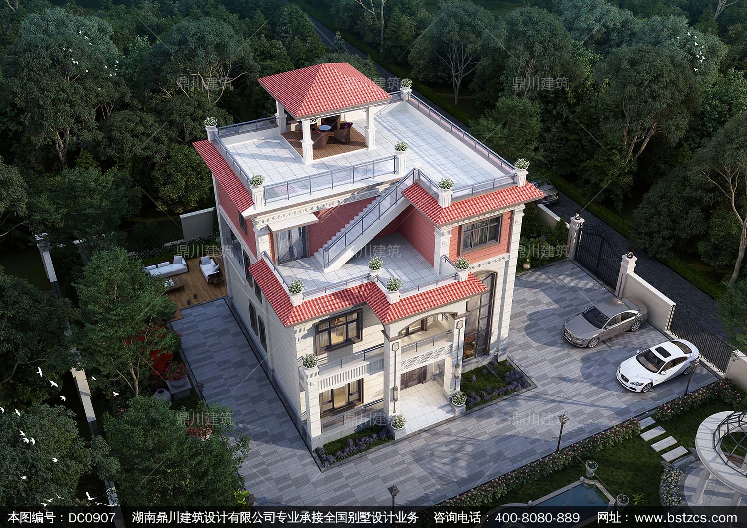 復式三層帶涼亭別墅效果圖及施工圖紙_新農村自建別墅設計,鼎川建筑