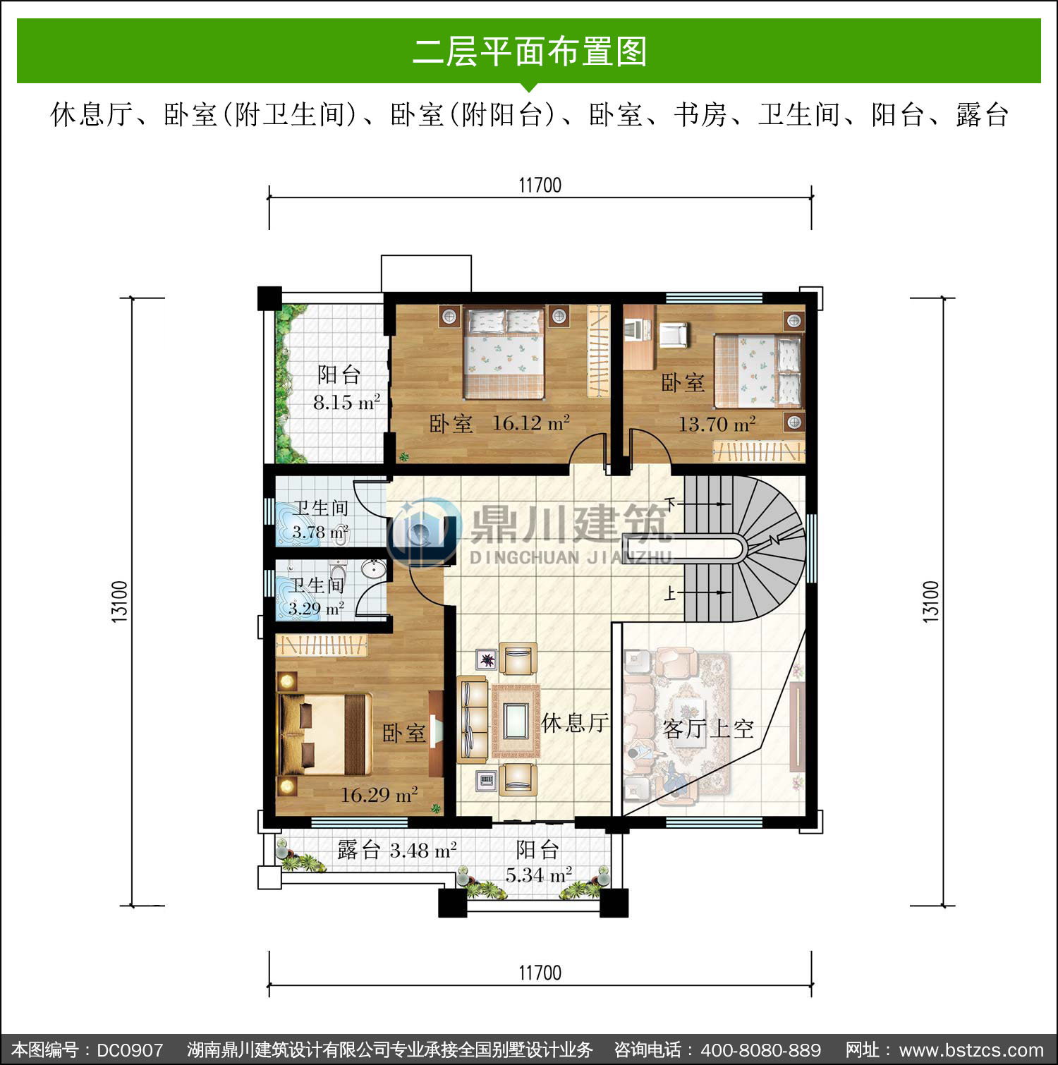 | 二 層: | 休息廳、臥室(附衛生間)、臥室(附陽臺)、臥室、書房、衛生間、陽臺、露臺 | |||