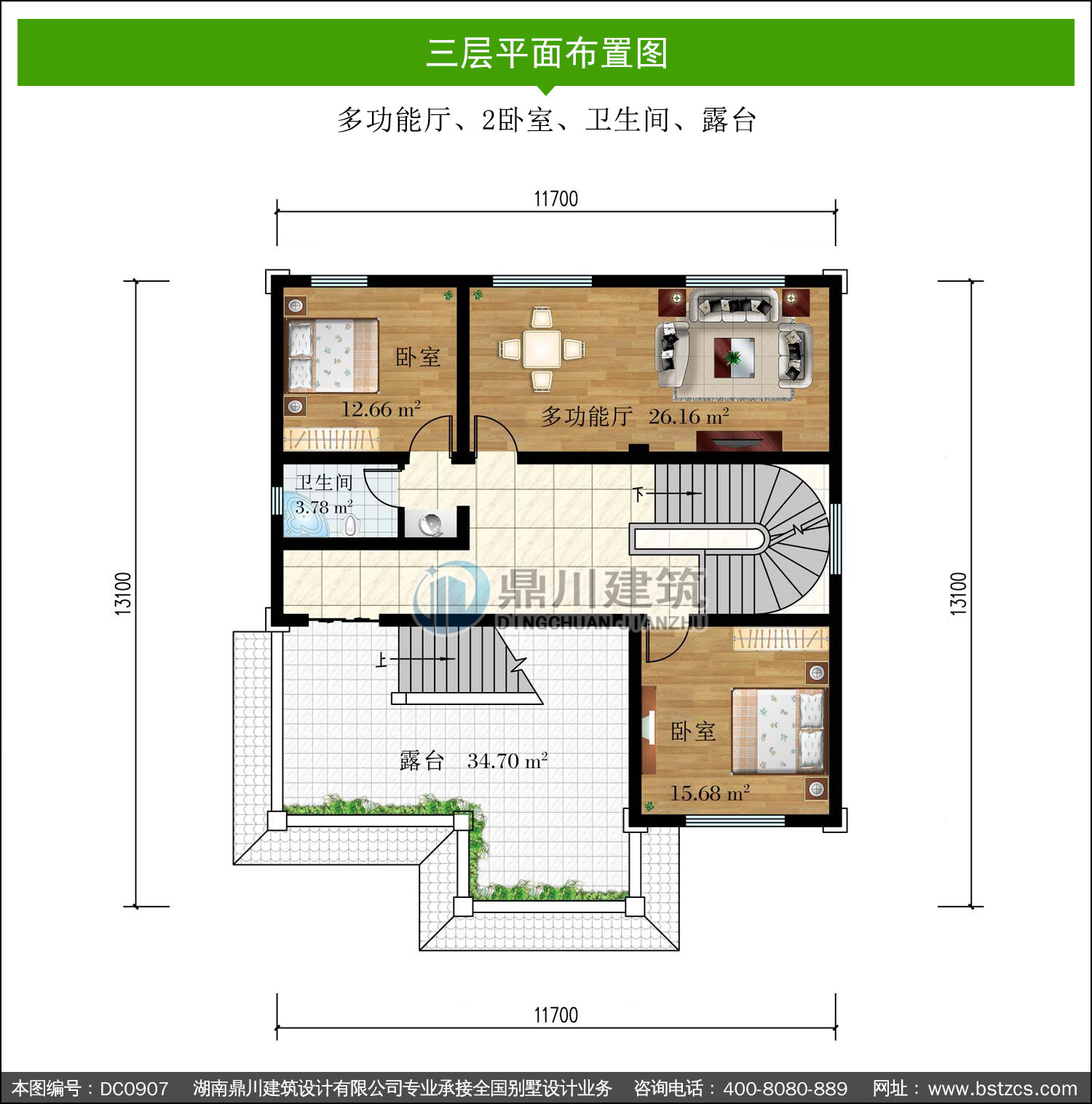 | 三 層: | 多功能廳、2臥室、衛生間、露臺 | |||