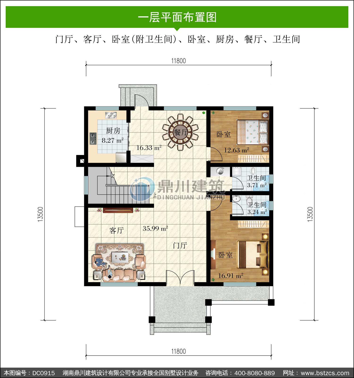 | 一 層: | 門廳、客廳、臥室(附衛生間)、臥室、廚房、餐廳、衛生間 | |||