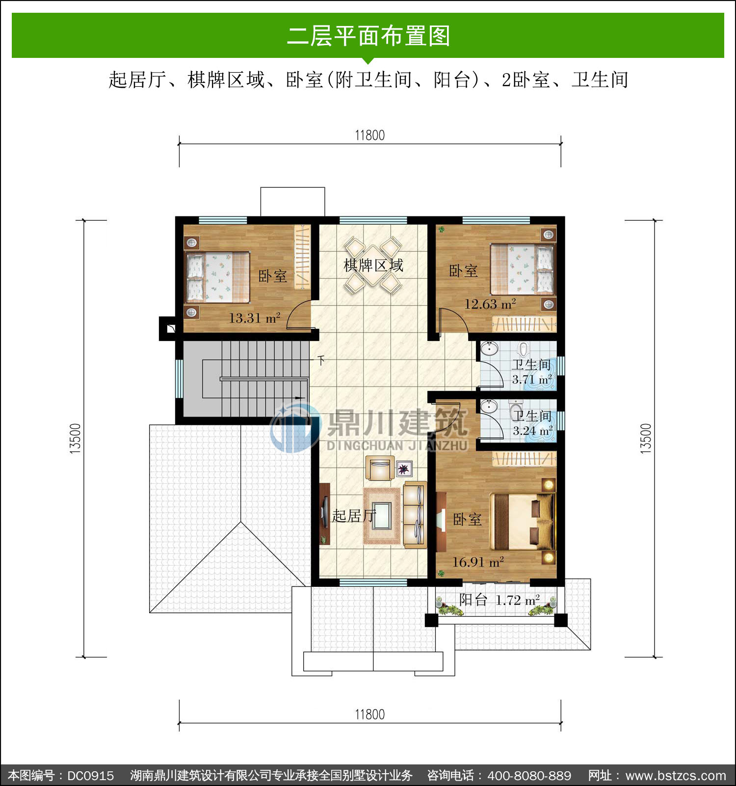 | 二 層: | 起居廳、棋牌區域、臥室(附衛生間、陽臺)、2臥室、衛生間 | |||
