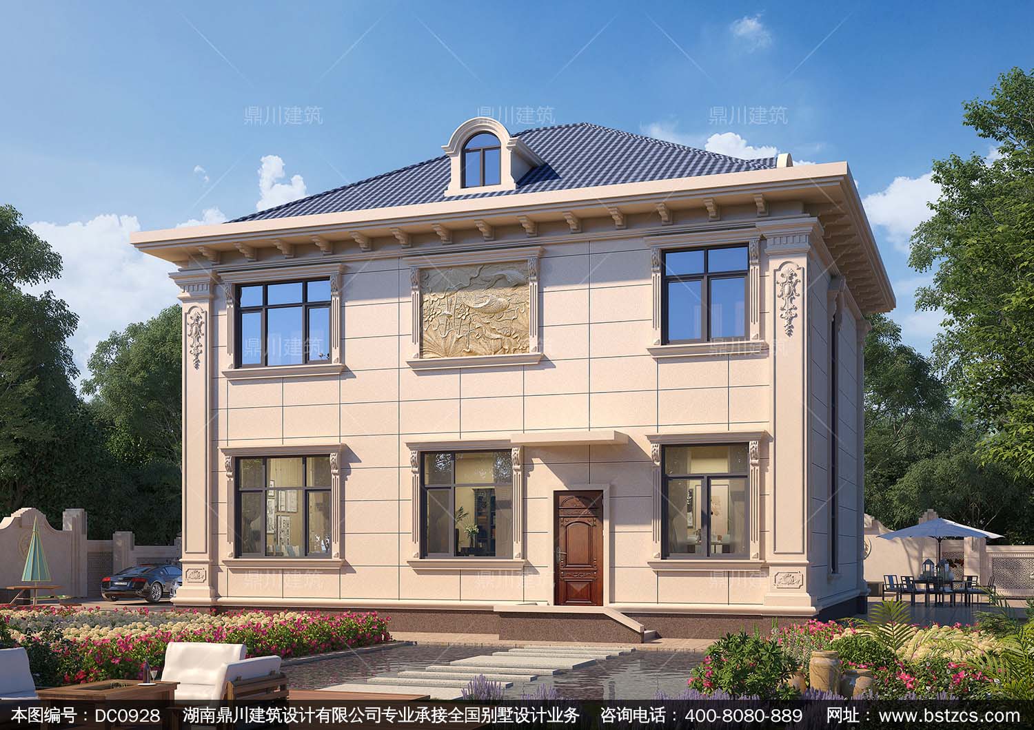 歐式二層帶露臺小別墅外觀效果圖及施工圖紙_農村自建房設計,鼎