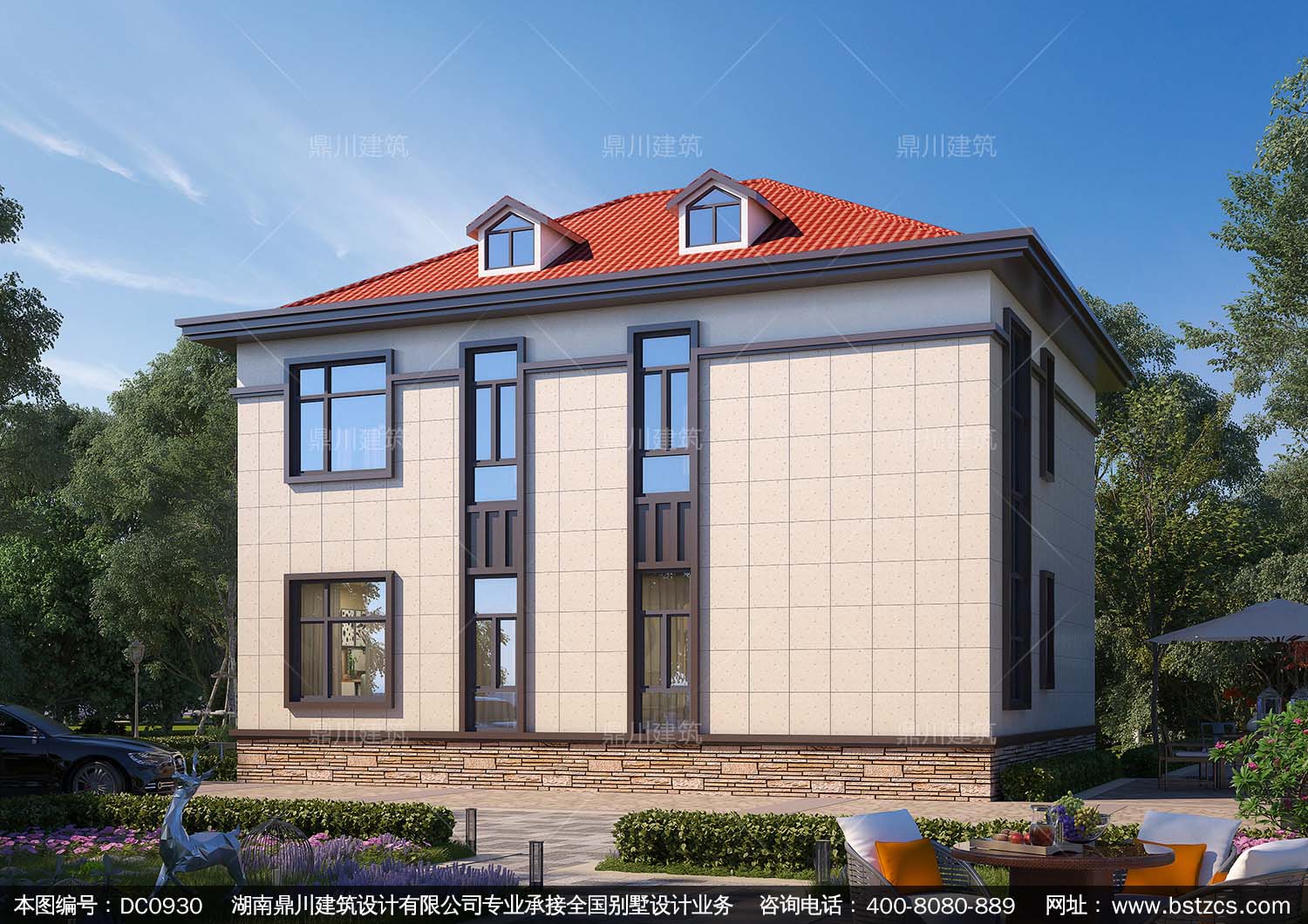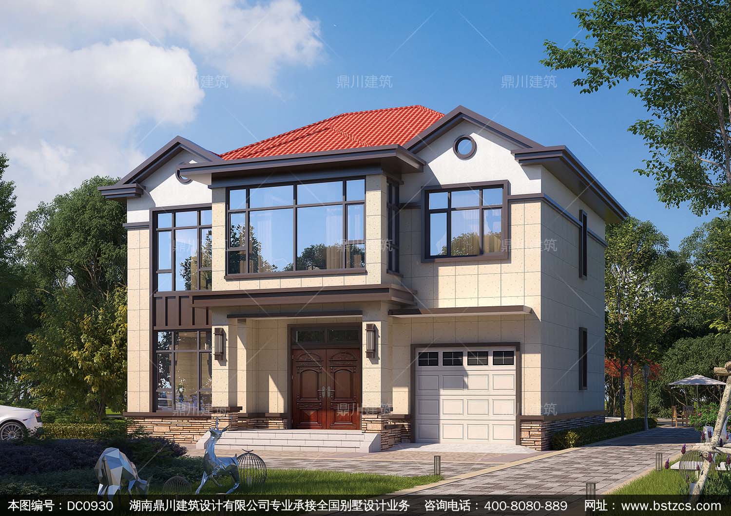 新中式二層帶車庫別墅施工圖紙及效果圖_農村自建房設計,鼎川建筑