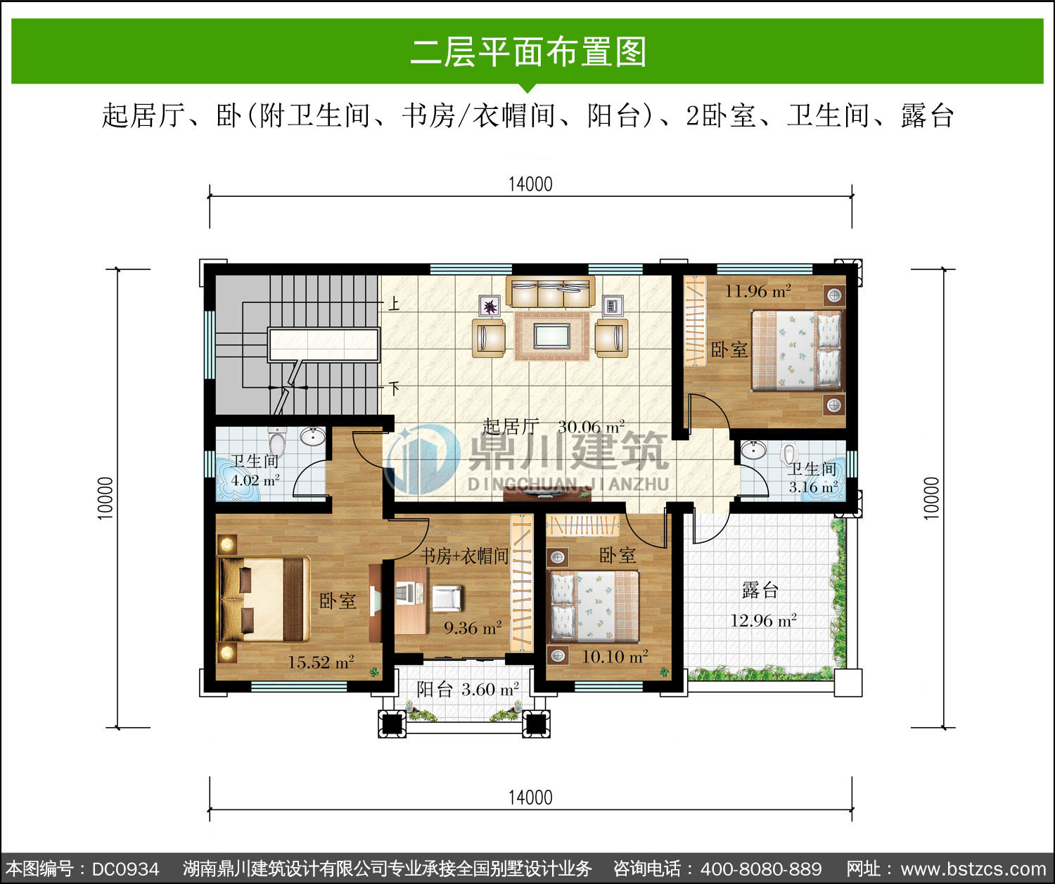 | 二 層: | 起居廳、臥(附衛(wèi)生間、書房/衣帽間、陽臺)、2臥室、衛(wèi)生間、露臺 | |||