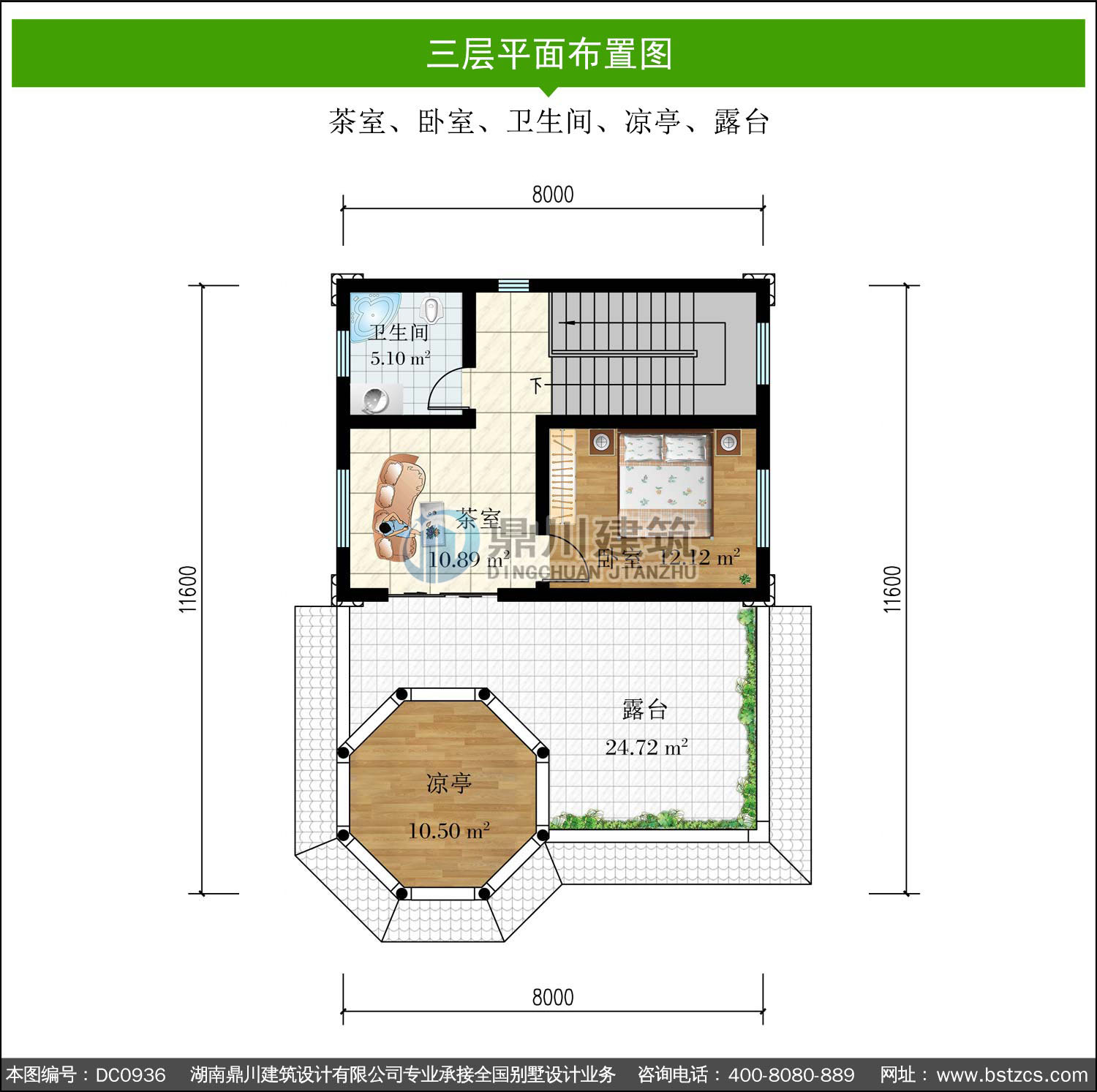 | 三 層: | 茶室、臥室、衛(wèi)生間、涼亭、露臺 | |||