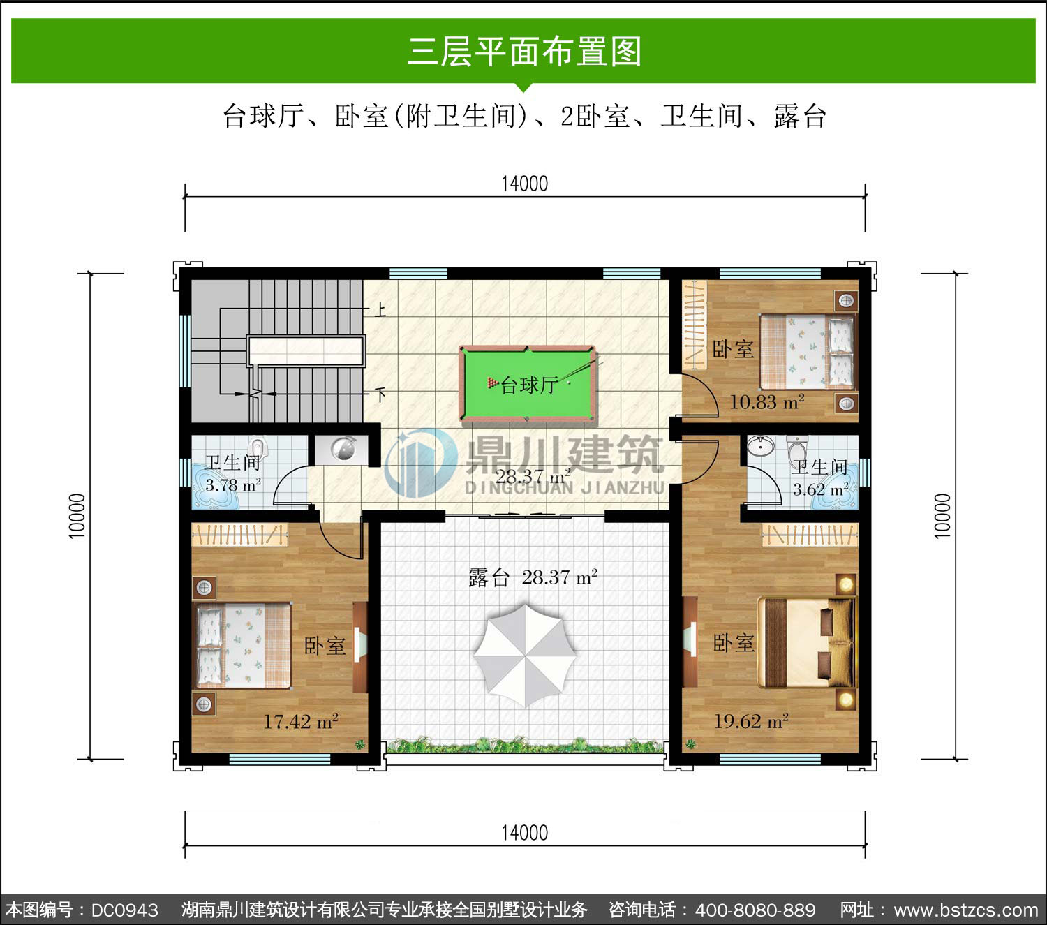 | 三 層: | 臺球廳、臥室(附衛生間)、2臥室、衛生間、露臺 | |||