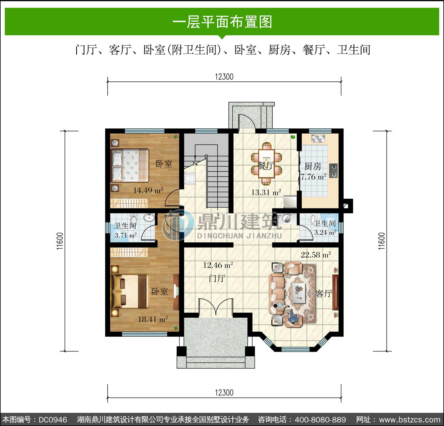 | 一 層: | 門廳、客廳、臥室(附衛生間)、臥室、廚房、餐廳、衛生間 | |||