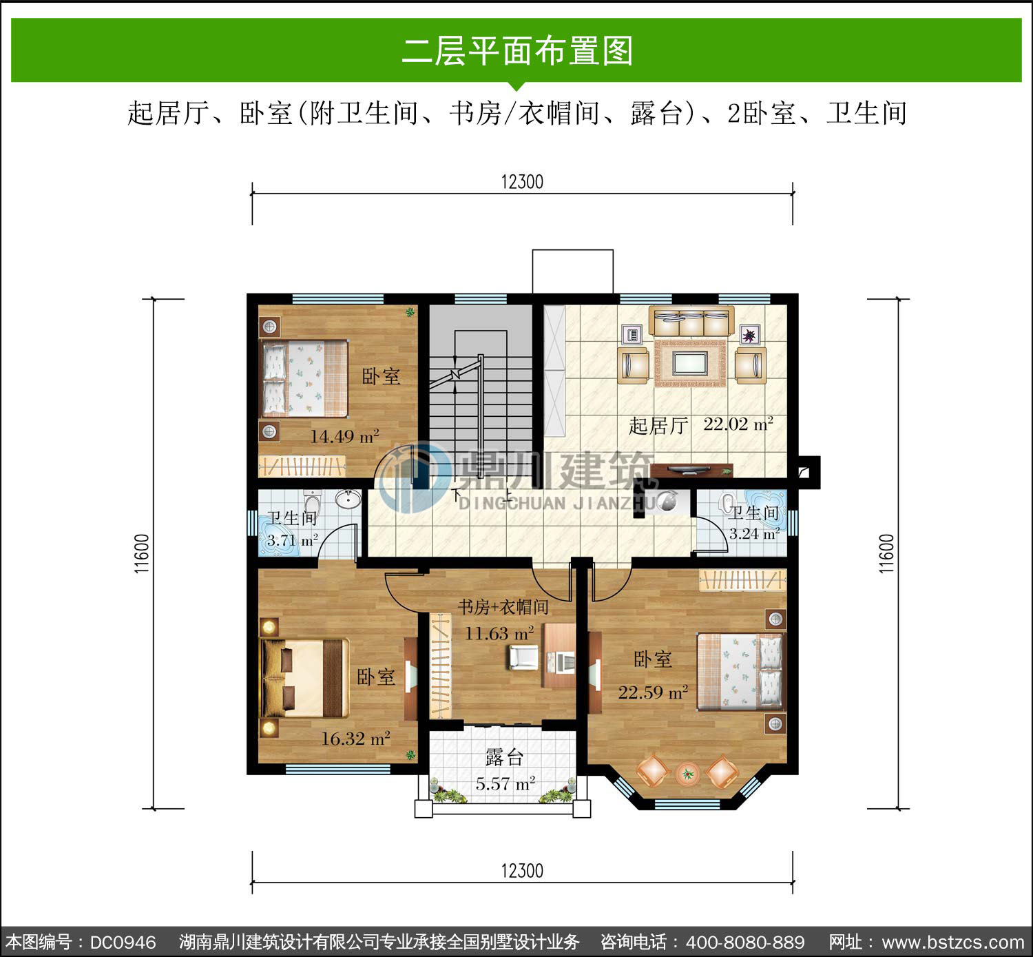 | 二 層: | 起居廳、臥室(附衛生間、書房/衣帽間、露臺)、2臥室、衛生間 | |||