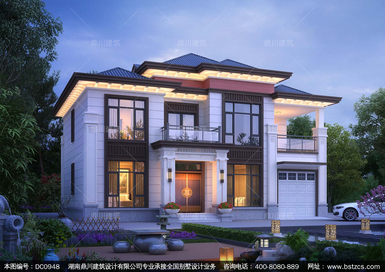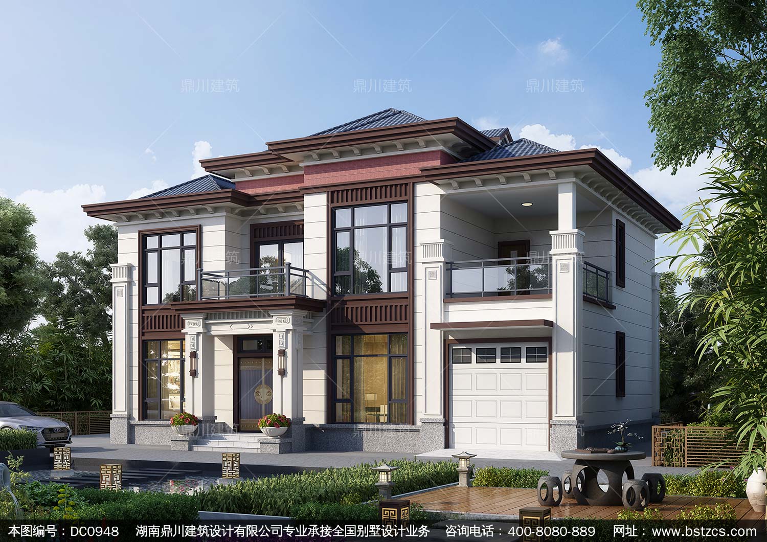 大氣二層新中式帶車庫別墅圖紙及效果圖_農村兩層自建別墅設計,鼎川建筑