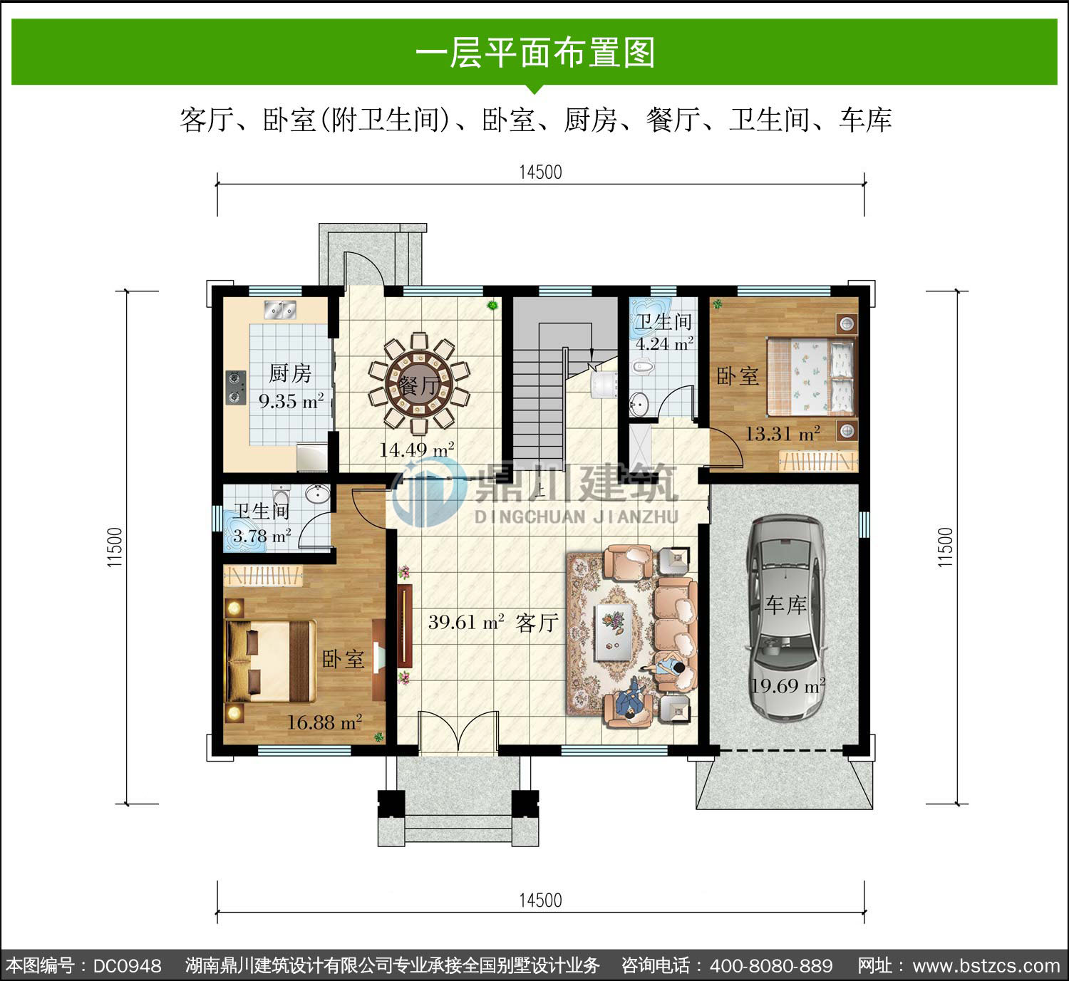 | 一 層: | 客廳、臥室(附衛生間)、臥室、廚房、餐廳、衛生間、車庫 | |||