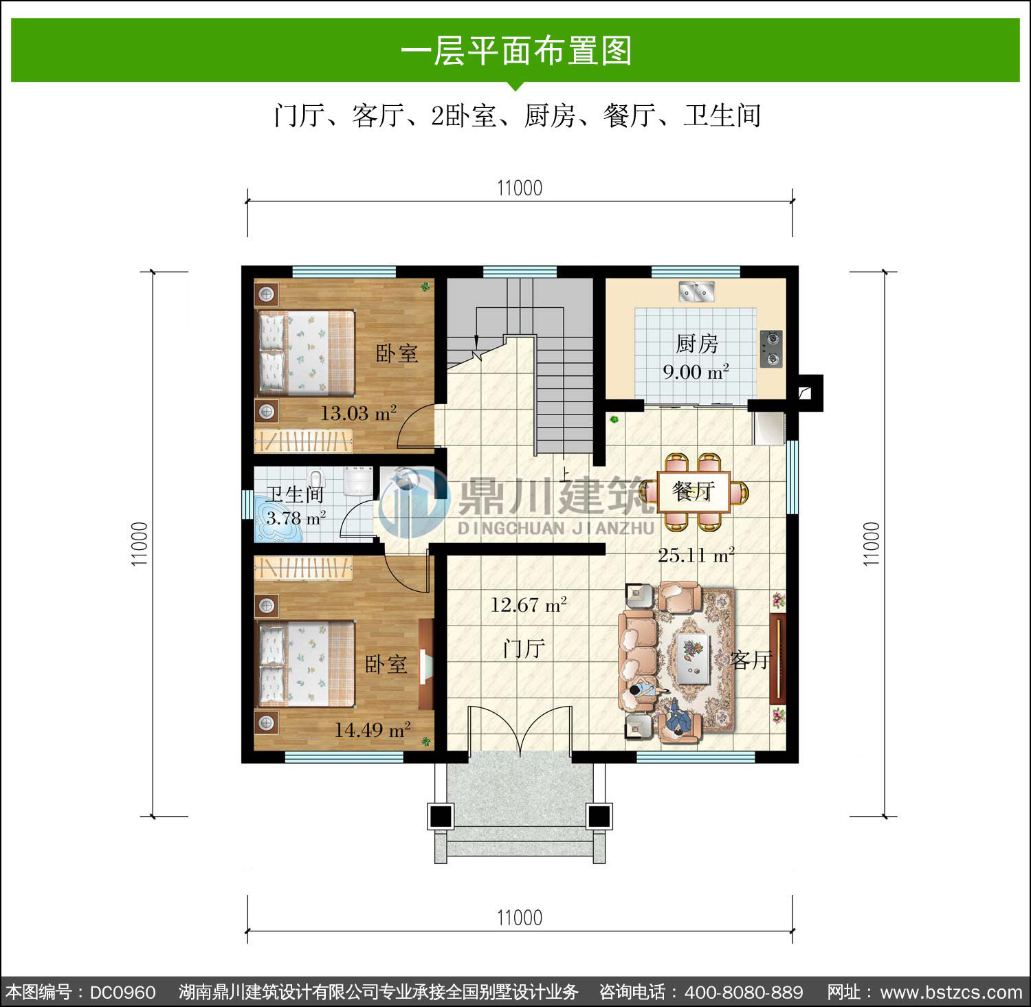 | 一 層: | 門廳、客廳、2臥室、廚房、餐廳、衛生間 | |||