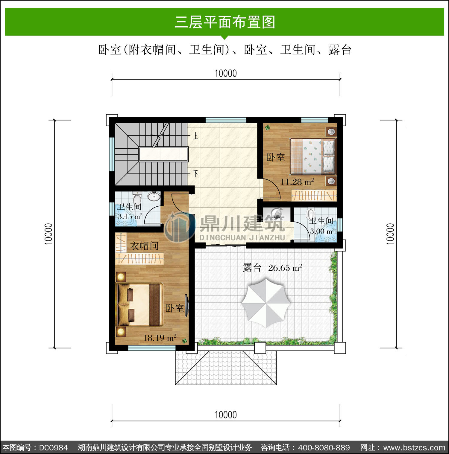 | 三 層: | 臥室(附衣帽間、衛(wèi)生間)、臥室、衛(wèi)生間、露臺 | |||