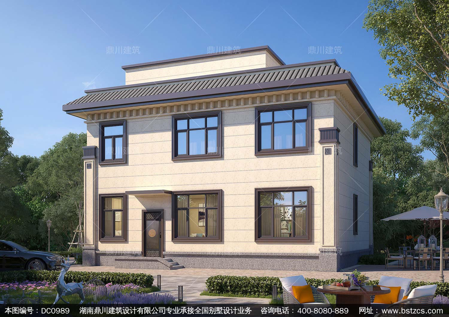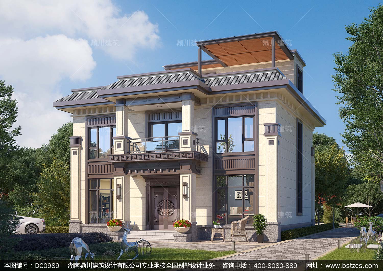 新中式三層復式別墅圖紙及效果圖_農村平屋頂別墅設計,鼎川建筑