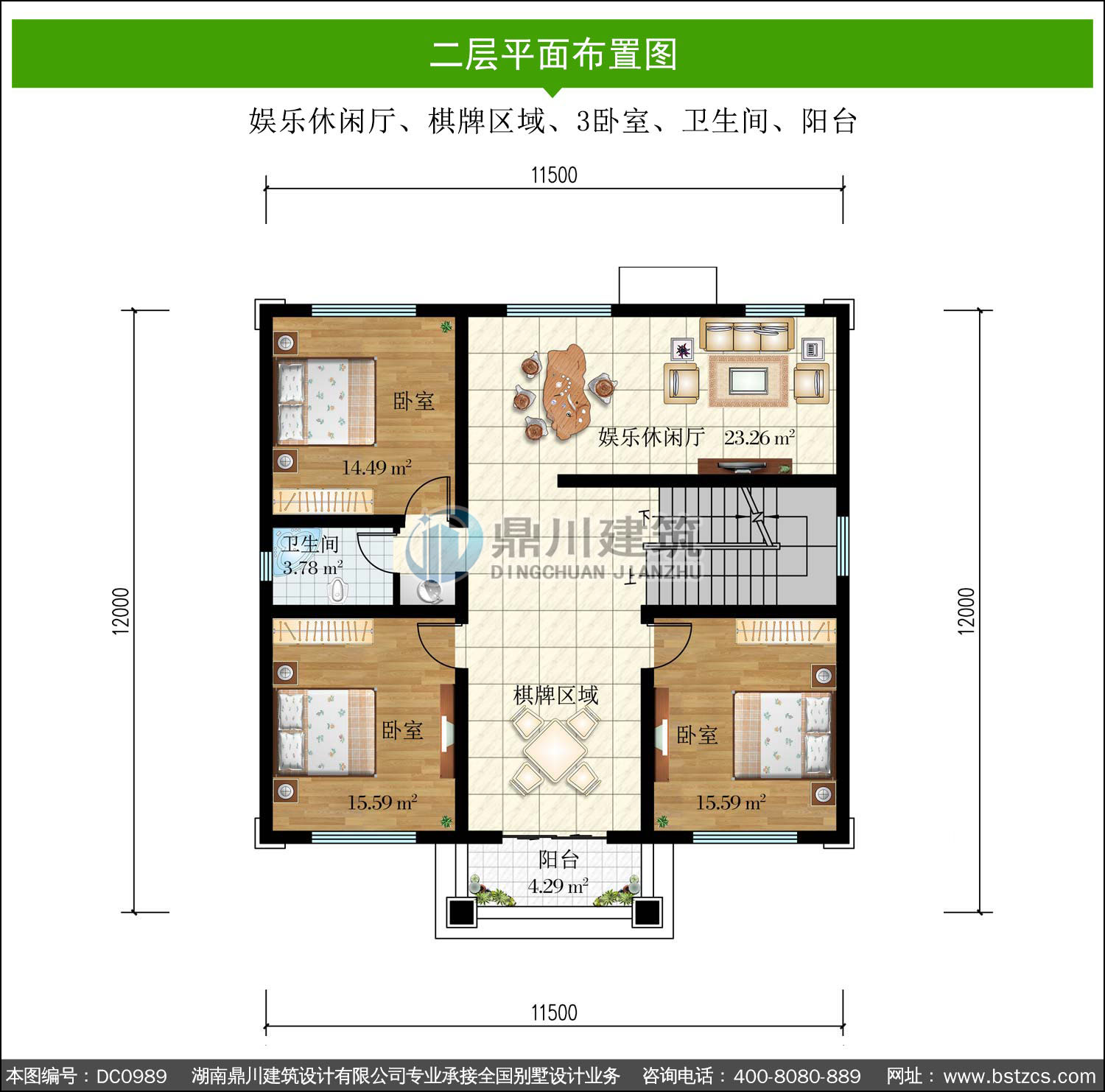 | 二 層: | 娛樂休閑廳、棋牌區域、3臥室、衛生間、陽臺 | |||