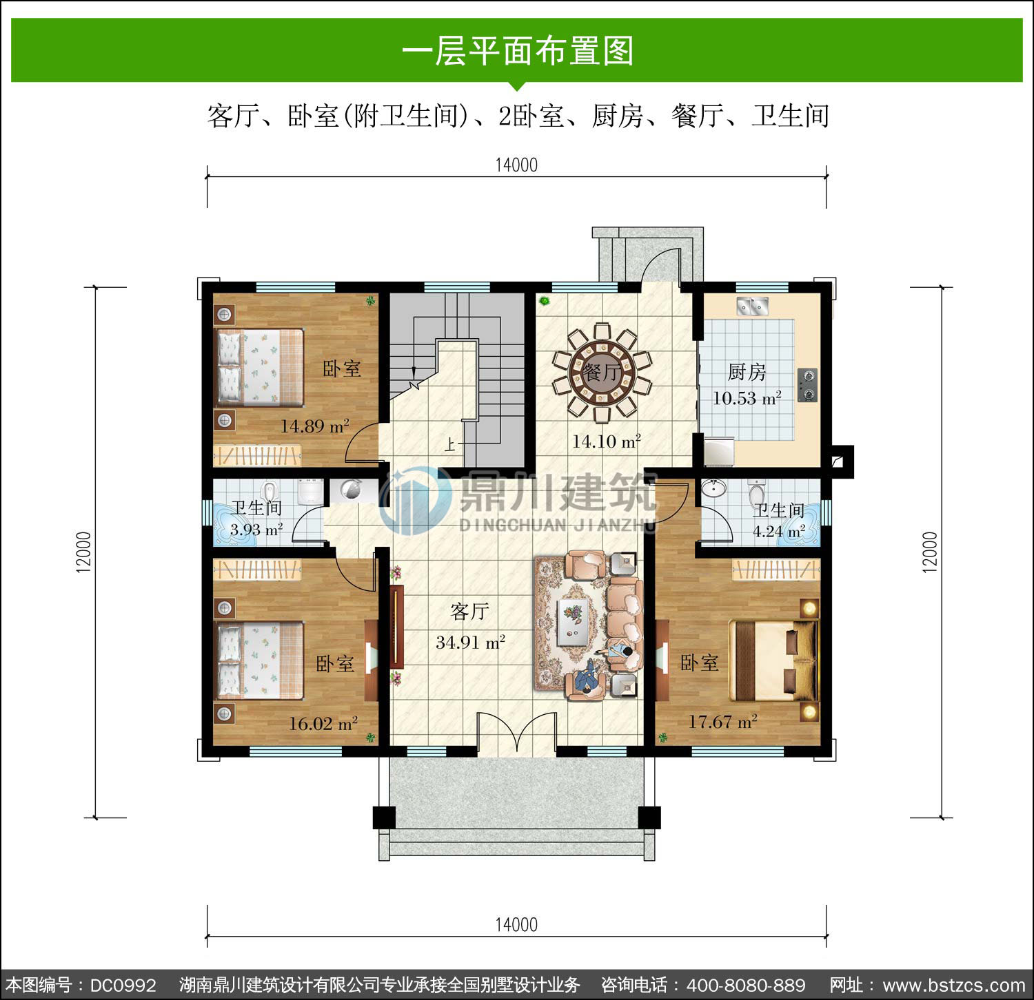 | 一 層: | 客廳、臥室(附衛生間)、2臥室、廚房、餐廳、衛生間 | |||