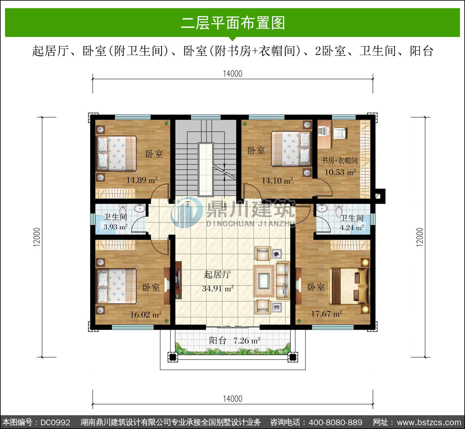 二層復式帶陽臺別墅施工圖紙及效果圖_新農村兩層自建房設計,鼎