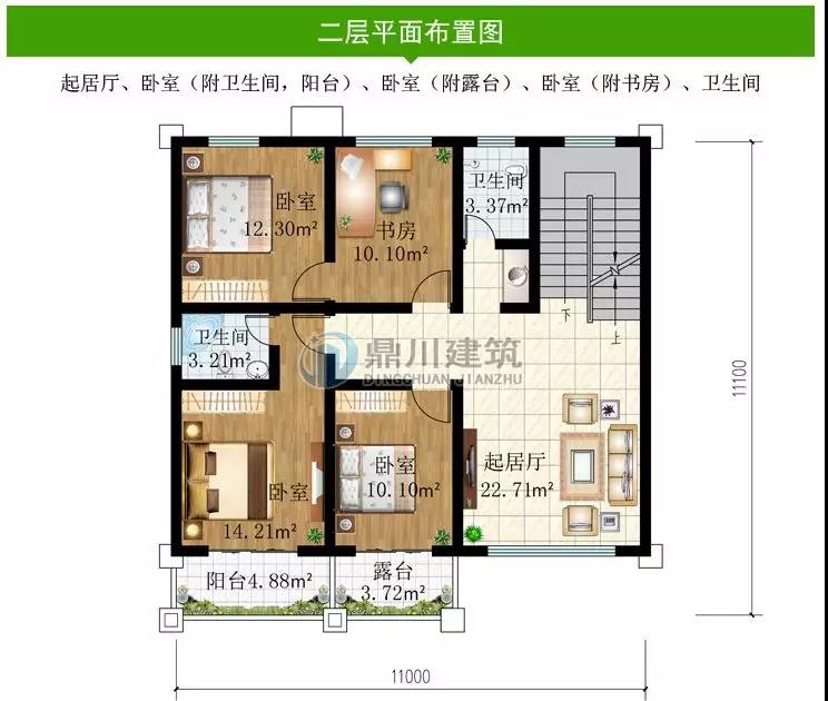 二層設有起居廳、臥室(附衛生間,陽臺)、臥室(附露臺)、臥室(附書房)、衛生間。