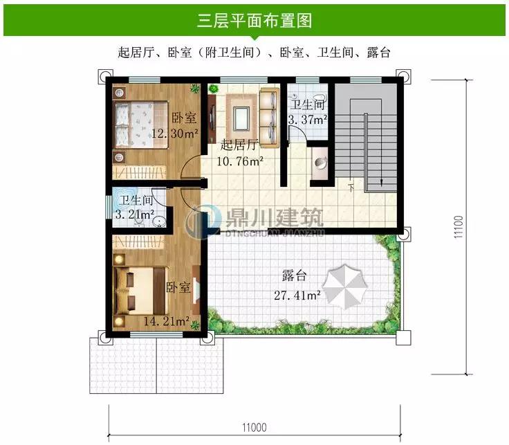 三層設有起居廳、臥室(附衛生間)、臥室、衛生間、露臺。