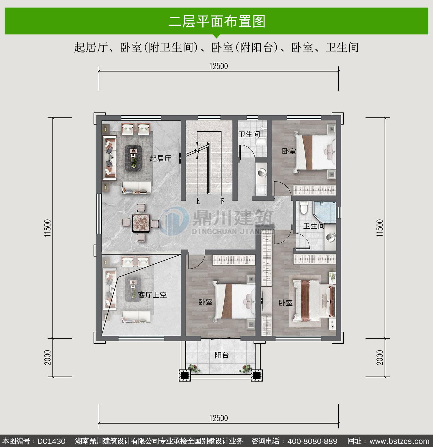 | 二 層: | 起居廳、臥室(附衛(wèi)生間)、臥室(附陽臺(tái))、臥室、衛(wèi)生間 | |||