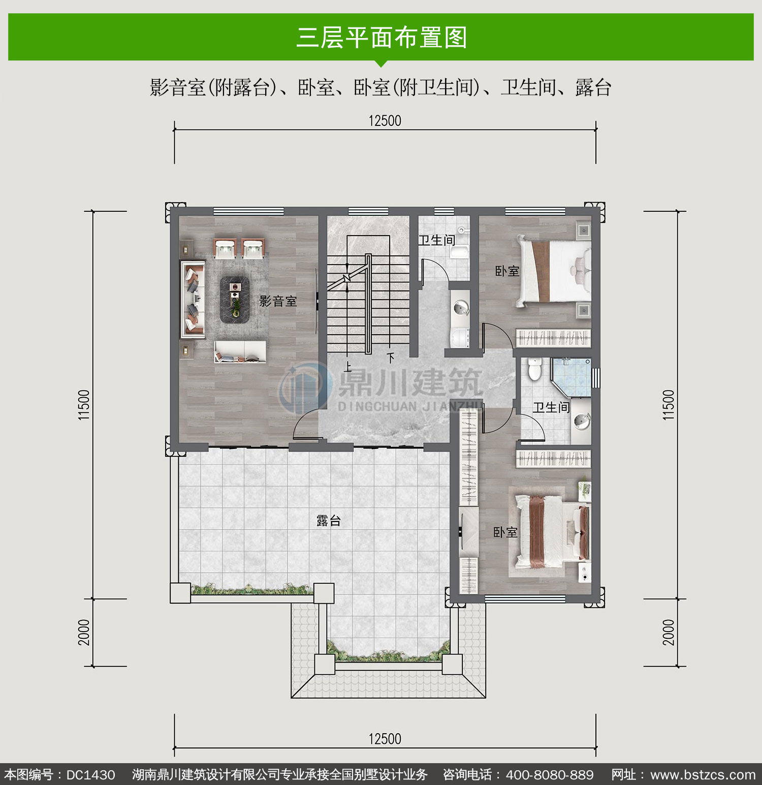 | 三 層: | 影音室(附露臺(tái))、臥室、臥室(附衛(wèi)生間)、衛(wèi)生間、露臺(tái) | |||