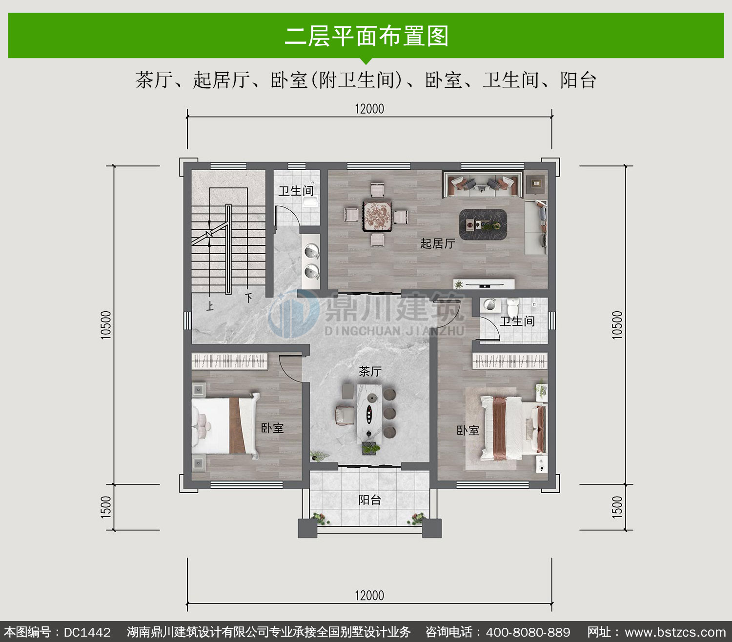 | 二 層: | 茶廳、起居廳、臥室(附衛生間)、臥室、衛生間、陽臺 | |||