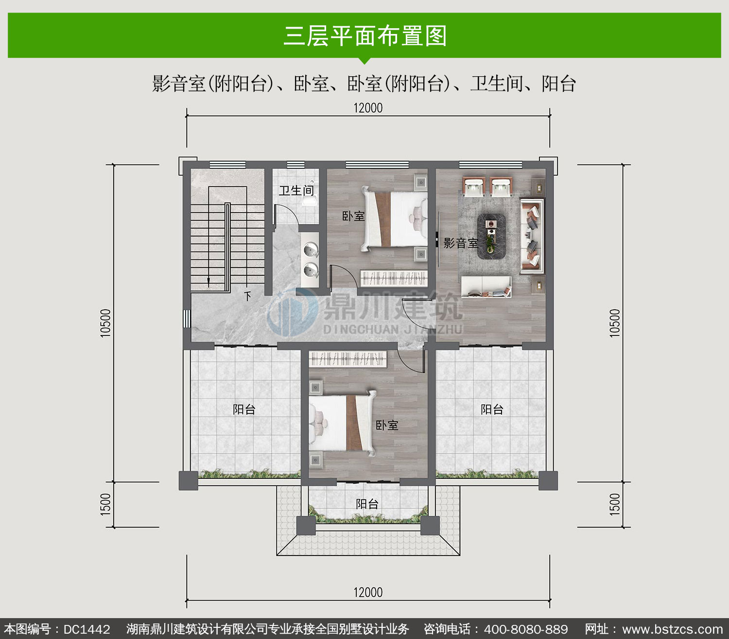 | 三 層: | 影音室(附陽臺)、臥室、臥室(附陽臺)、衛生間、陽臺 | |||