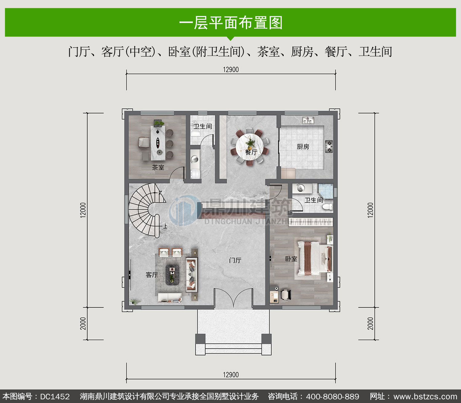 | 一 層: | 門廳、客廳(中空)、臥室(附衛生間)、茶室、廚房、餐廳、衛生間 | |||
