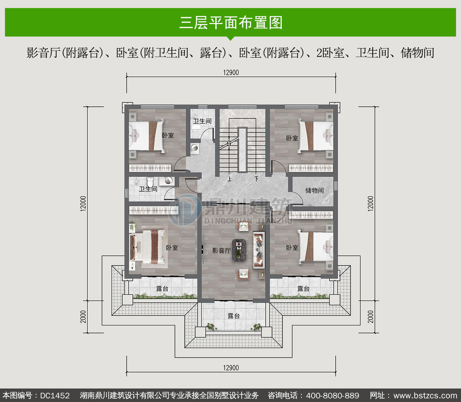 | 三 層: | 影音廳(附露臺)、臥室(附衛生間、露臺)、臥室(附露臺)、2臥室、衛生間、儲物間 | |||